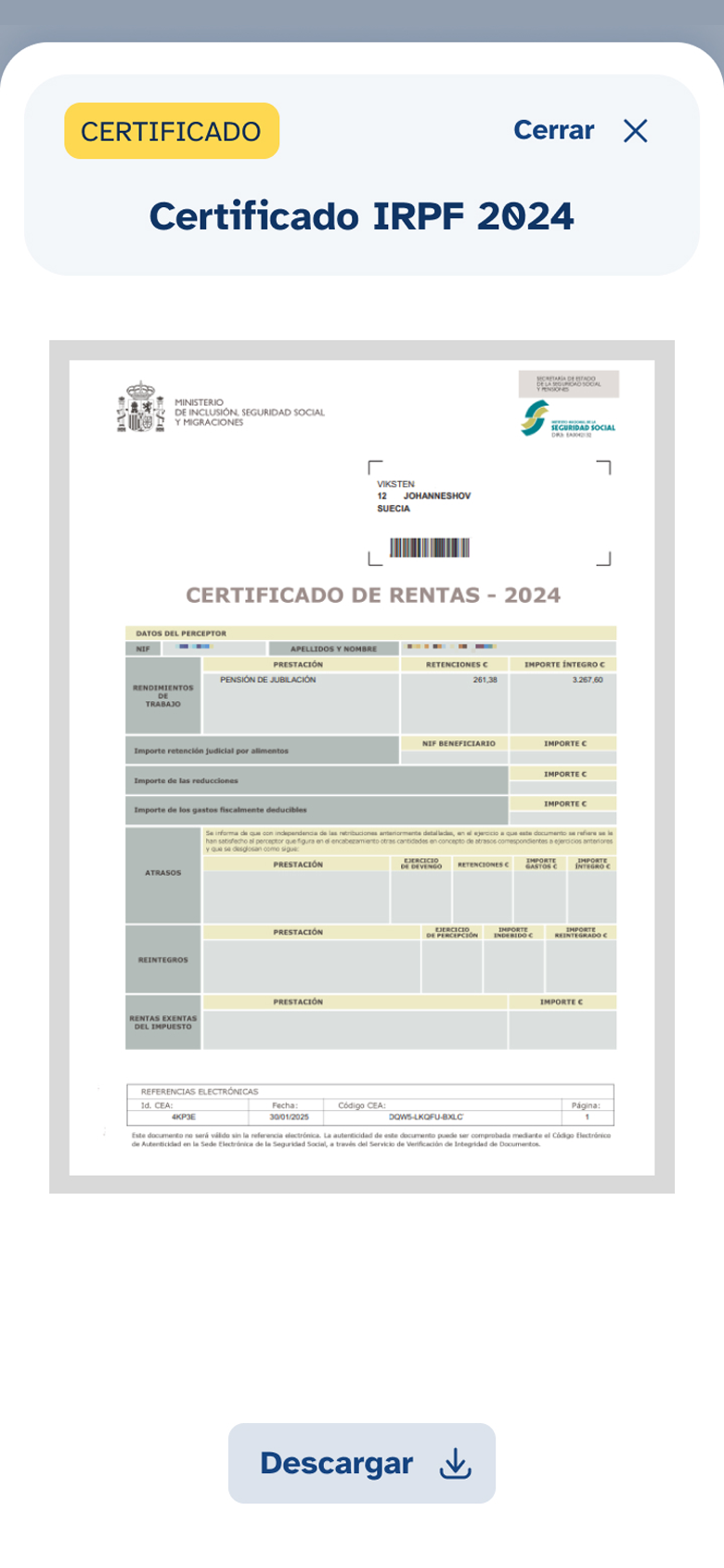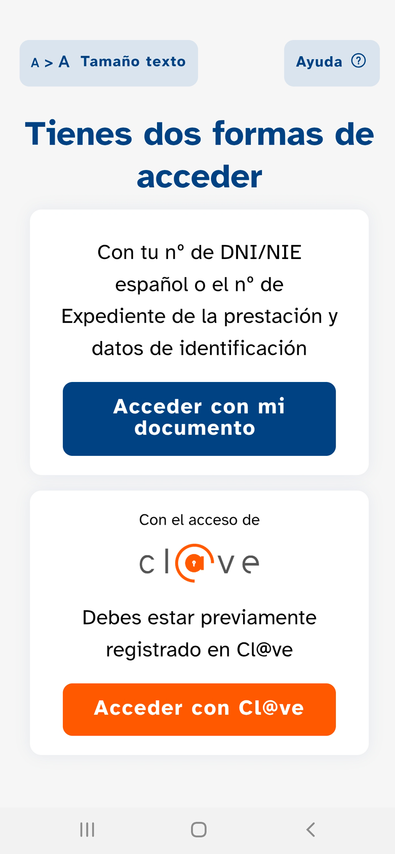 Realizar el registro: este paso solo se hace una vez. Para registrarse, proporcione su DNI o número de expediente de pensión. También puede usar Cl@ve. Introduzca su país de residencia y fecha de nacimiento. Seleccione el documento para la video identificación mostrando ambos lados a la cámara. Luego muestre su rostro siguiendo las instrucciones de la aplicación.